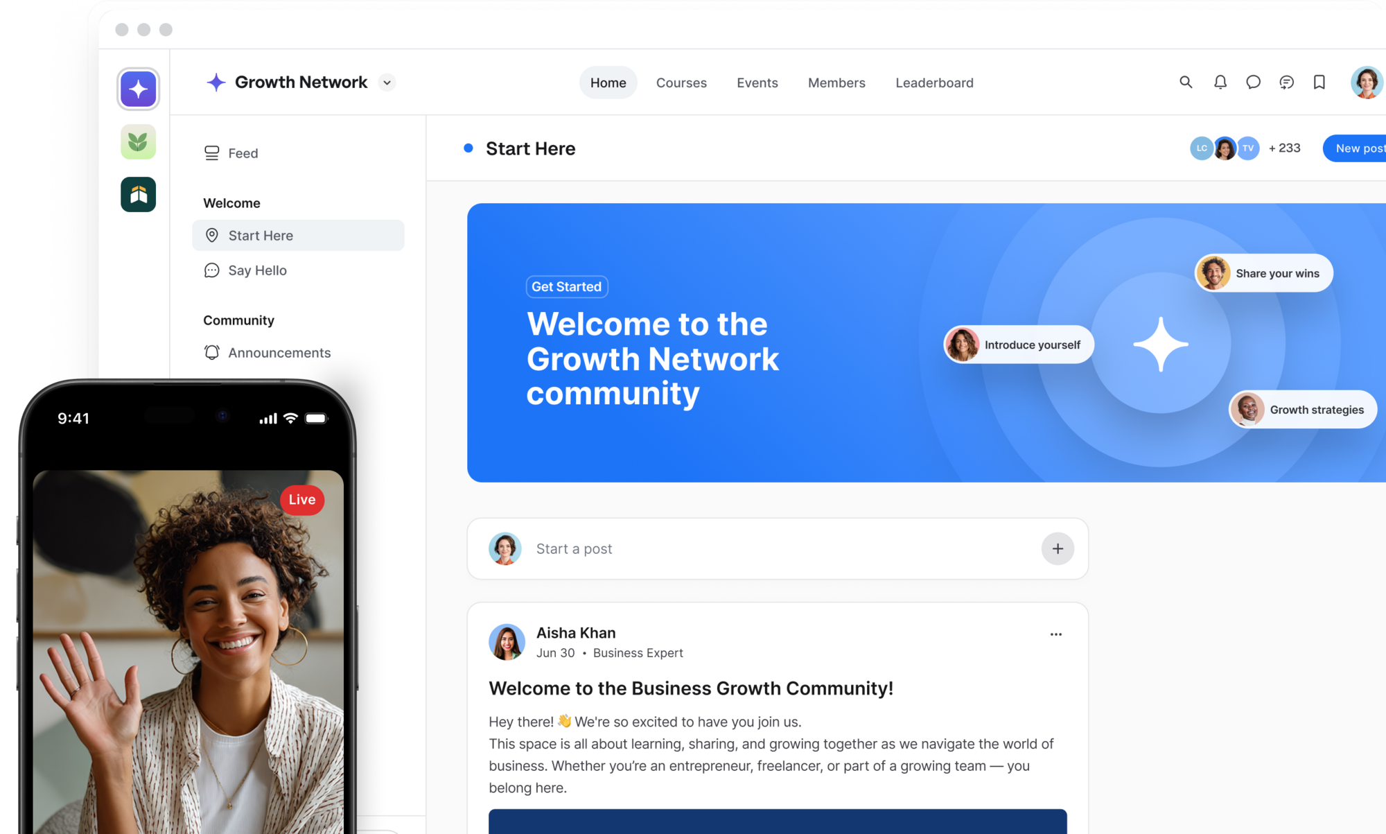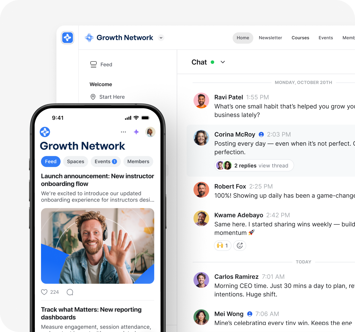 Conversations, events, courses, and payments in one place — not stitched together through integrations
