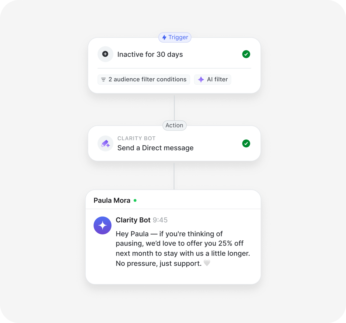 Personalized onboarding, AI that answers and moderates with context, and workflows that engage members at the right moment — automatically.