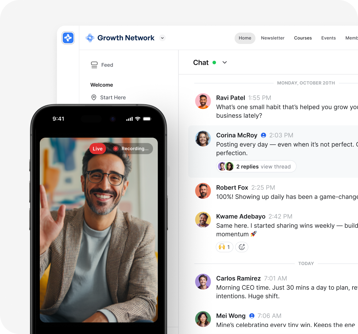 Live events that stream, record, and follow up automatically — no Zoom links, no manual uploads