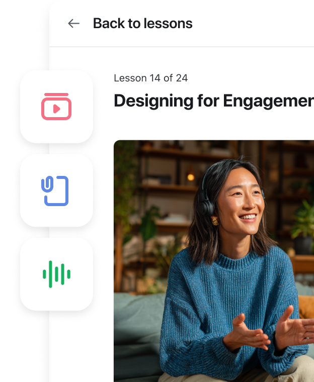 You can now add up to 15 additional file resources, including PDFs, images, or videos, to enrich and complement your course content. Simply visit the lesson editor, toggle over to “files”, and upload your assets.