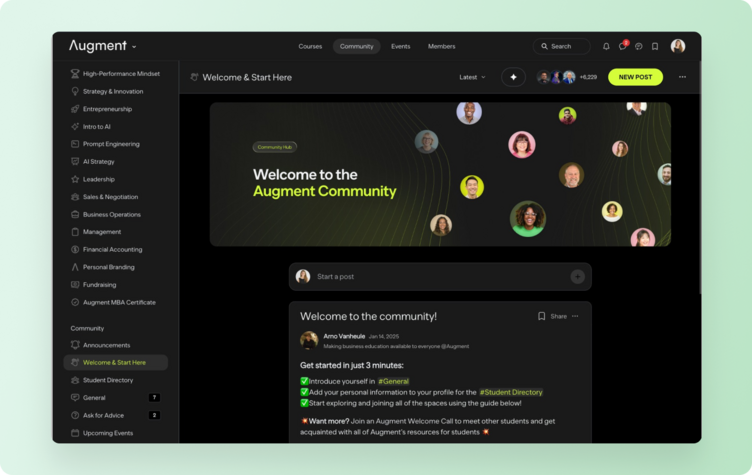 As Augment scaled, the split between Thinkific and Circle created friction. Students toggled between platforms — one for courses, another for community. "We wanted to have the courses and community all in one place," Ariel says.