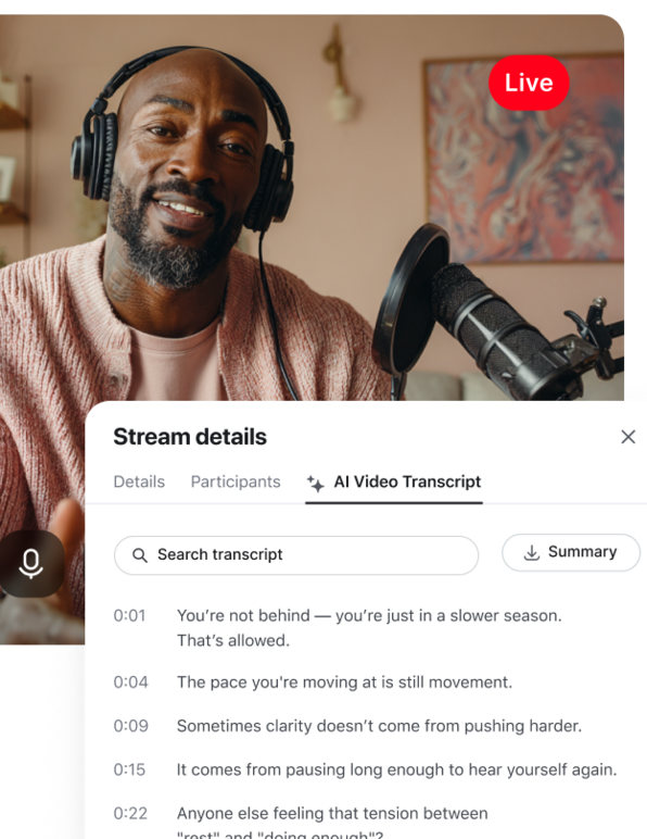 Live streams are for broadcasting to a larger audience, like big online summits, webinars, and more. Only hosts and co-hosts can turn their mics and cameras on, while participants can interact in the chat or raise their hands to be brought on to the stage by a host.