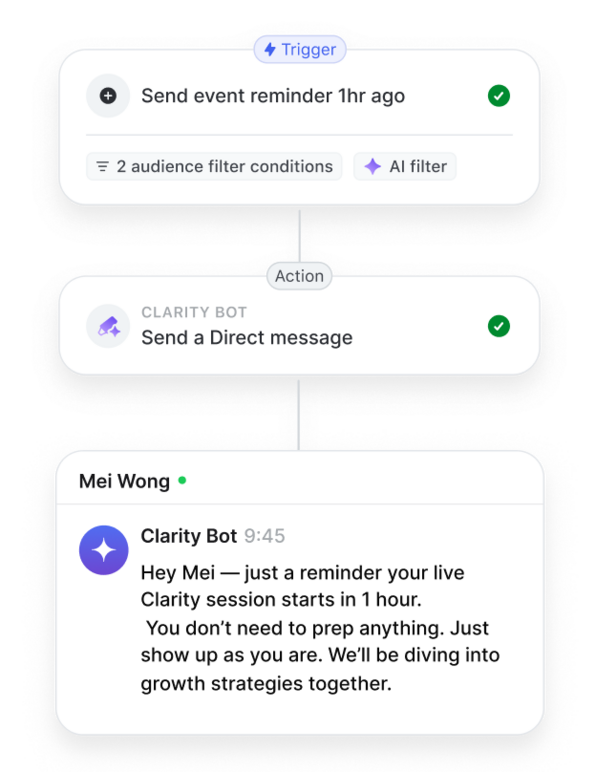 Create event pages, send reminders, host sessions, and share replays — all in one place where your members already connect.