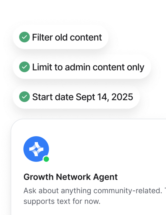 Les Agents IA sont parfaits pour répondre à des questions simples. Pour les questions plus complexes, ils peuvent guider les membres de votre communauté à travers différentes étapes ou les renvoyer vers un humain le cas échéant. Vous pouvez également configurer des blocs de texte personnalisés pour diviser efficacement les réponses en plusieurs parties.