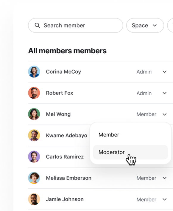 Les espaces de chat représentent des canaux en temps réel, adaptés à différents objectifs et à différents sujets, comme Slack et Discord. Les membres peuvent rejoindre les espaces de chat et interagir immédiatement (si vos espaces sont publics) ou vous pouvez les y ajouter (s’ils sont privés).
