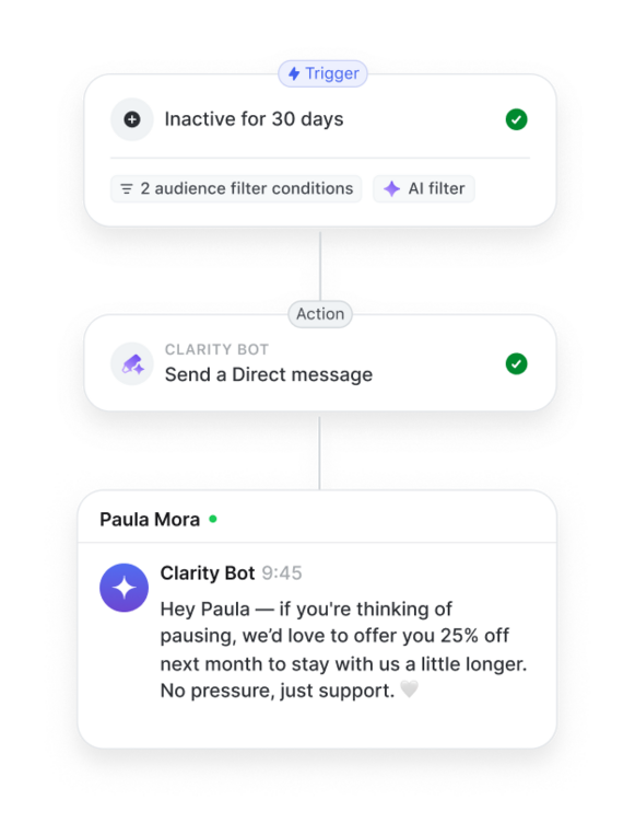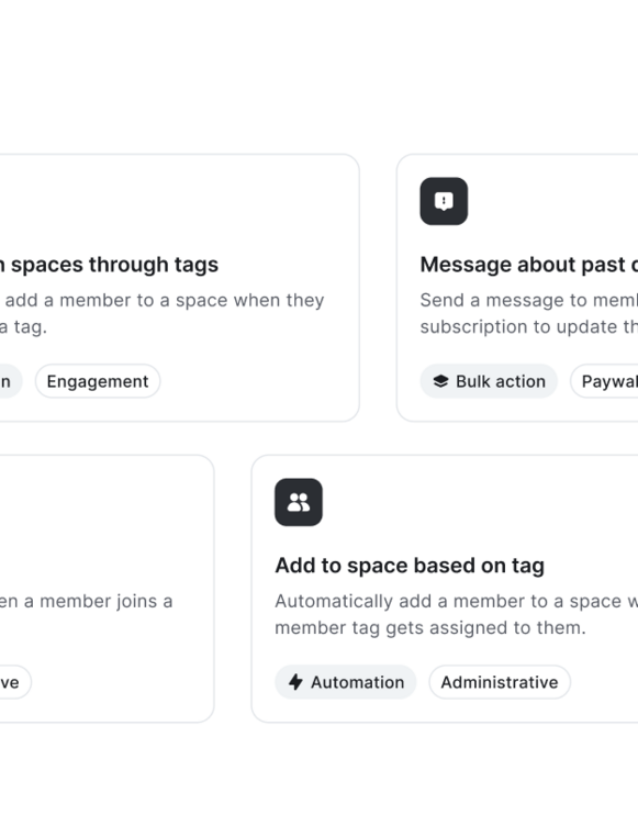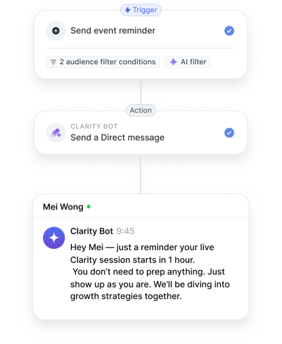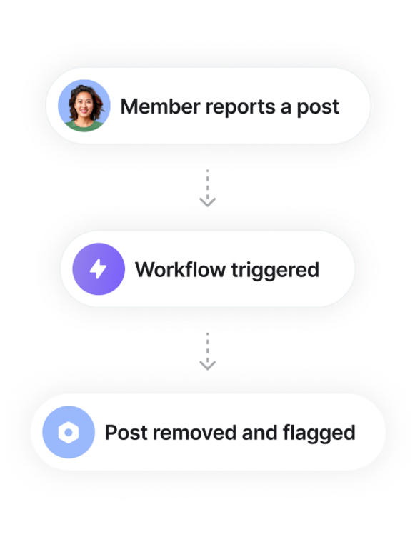 Automatisez les tâches répétitives. Déclenchez des suivis, planifiez des comptes à rebours ou réalisez des tâches administratives en masse, et gérez ainsi facilement votre communauté.